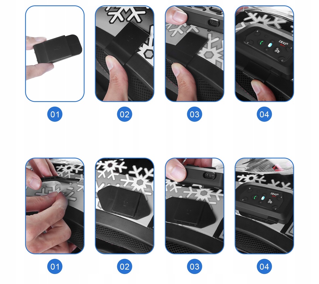 Interkom EJEAS V6 PRO+ posiada w zestawie dwa uchwyty montażowe pasujących do 99% kasków na rynku.