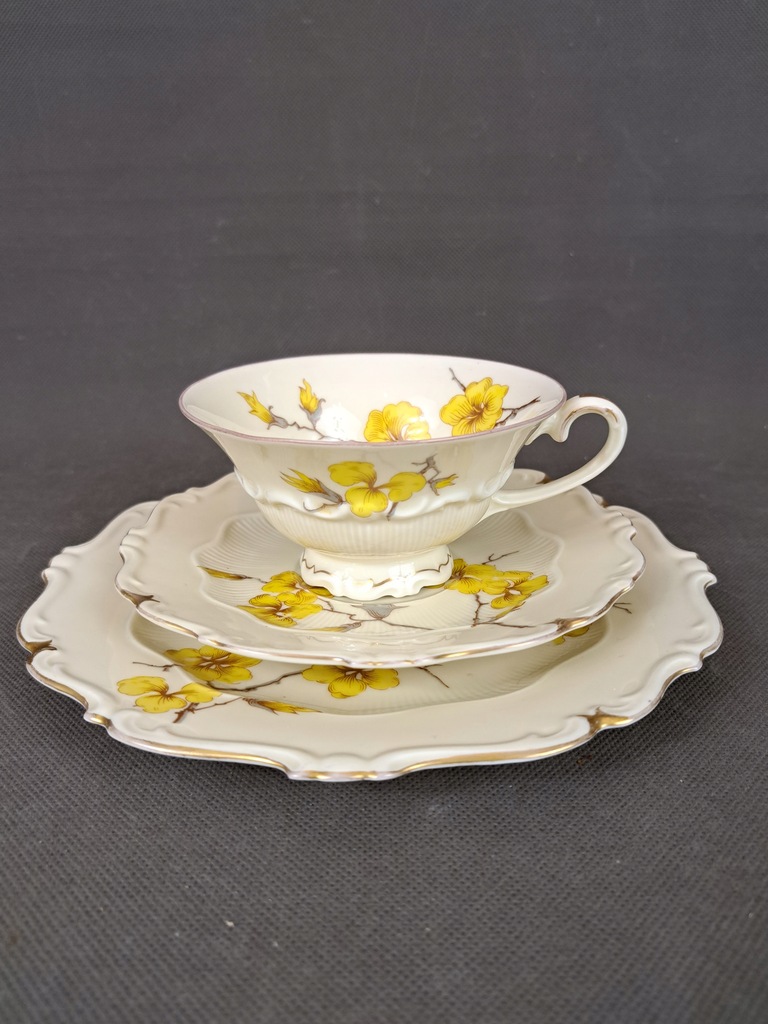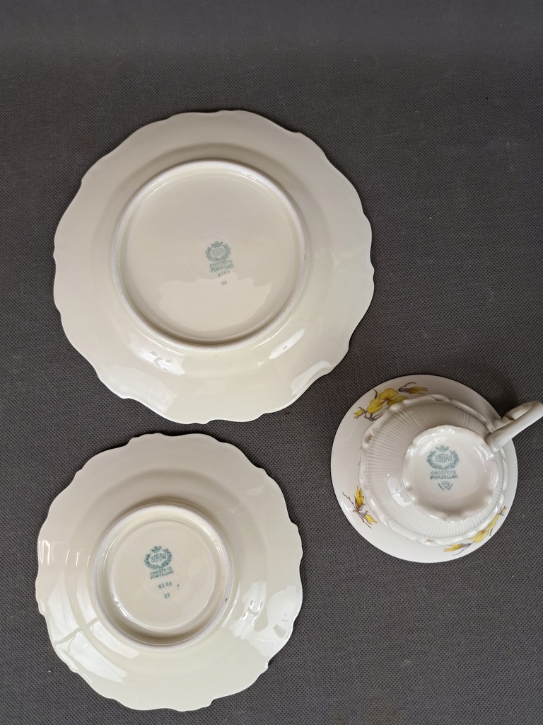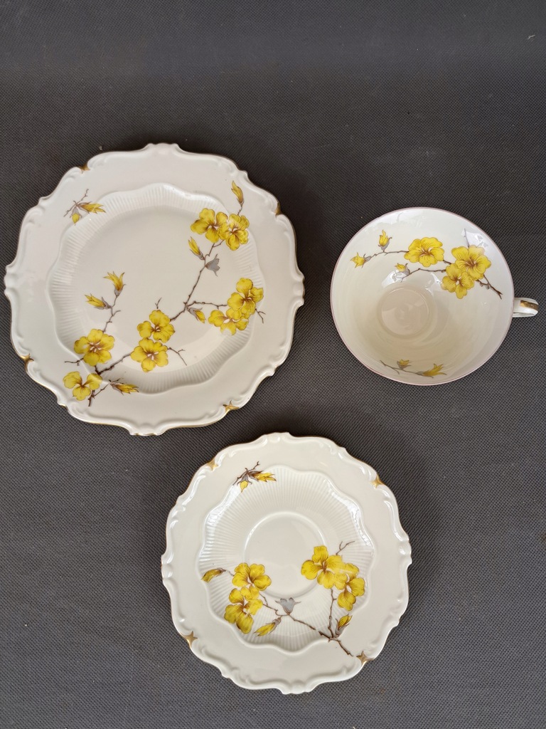 Porcelana koloru ecru, ozdobiona motywem kwiatów forsycji i złoceniami.