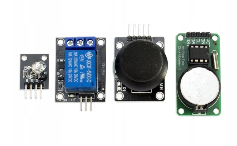 - Bogaty, powiększony zestaw startowy Arduino z odbiornikiem podczerwieni, czytnikiem RFID, modułem zegara czasu rzeczywistego, silnikiem krokowym, detektorem drgań, czujnikiem poziomu wody i wieloma innymi modułami