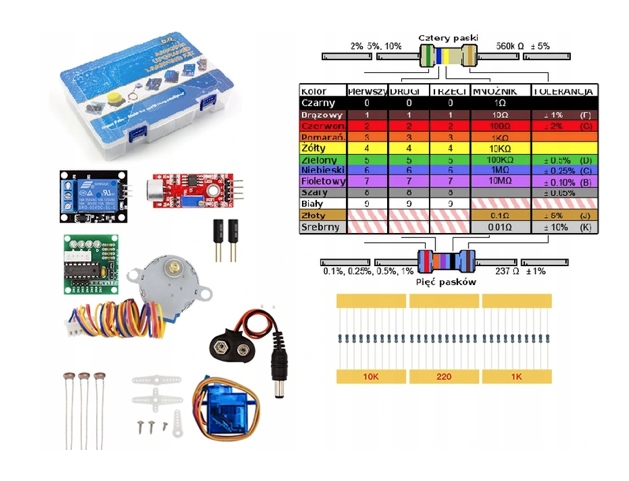 38. Zestaw rezystorów: 220 Ohm – 10 szt., 1k – szt., 10k – 10szt.