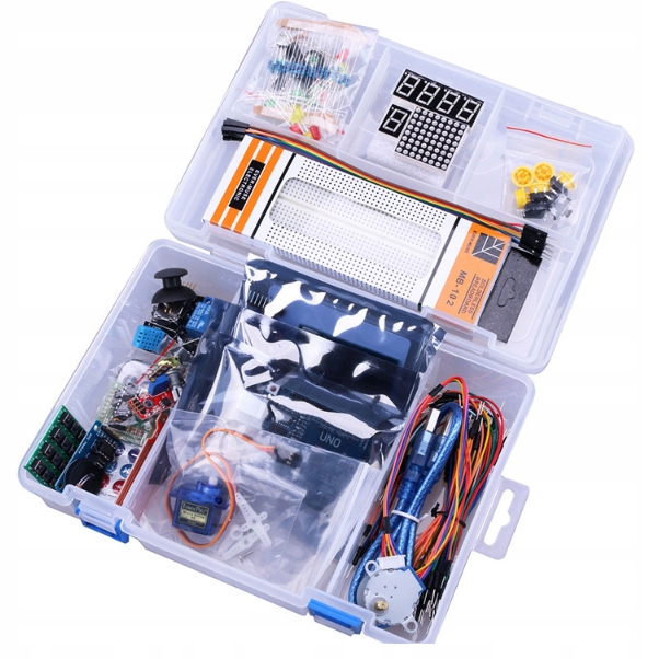 Rozpoczęcie pracy z Arduino jest łatwe i każdy może nauczyć się elektroniki i programowania dzięki temu zestawowi. Zestaw został oparty o płytkę zgodną z Arduino UNO. Dodatkowo w zestawie znajdują się różne elementy elektroniczne, kable, płytka stykowa co umożliwia w prosty sposób konstruowanie różnych układów elektronicznych sterowanych za pomocą Arduino UNO.