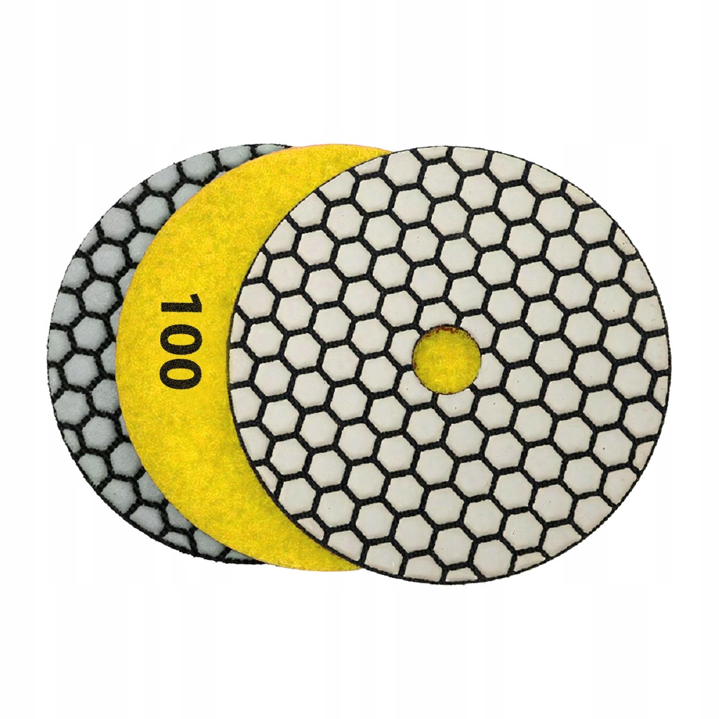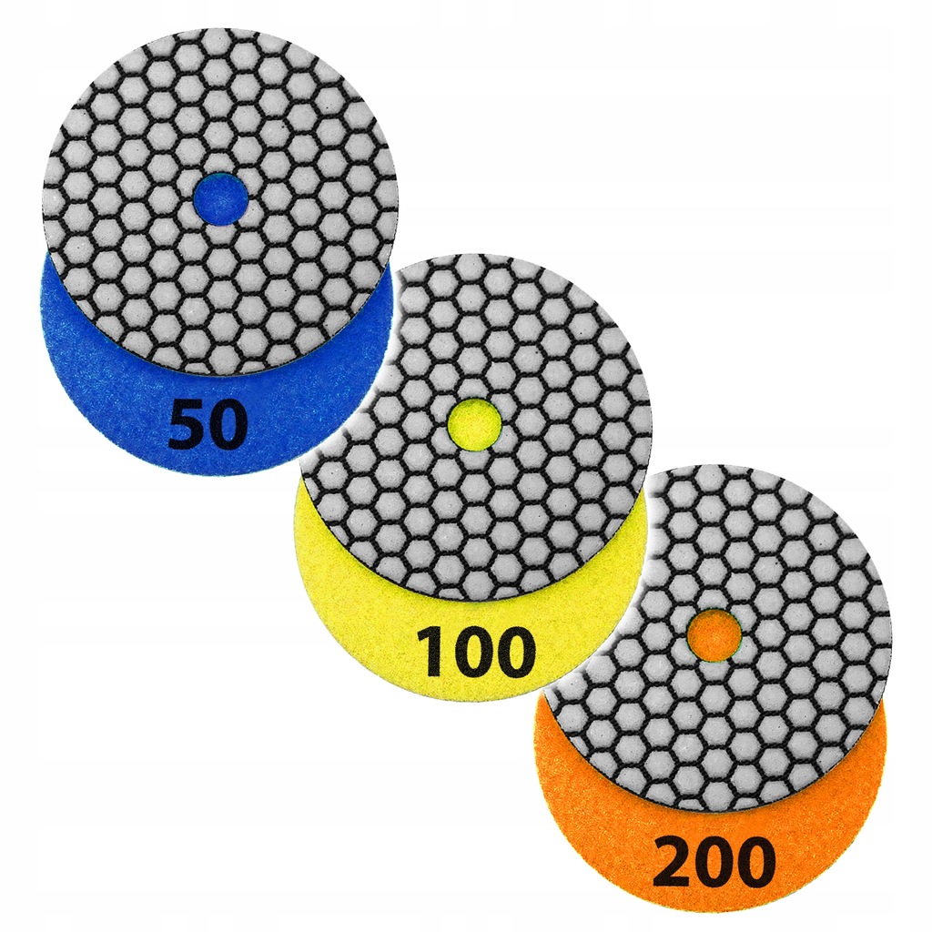 - 3 diamentowe tarcze100mm o różnych gradacjach do szlifowania i polerowania materiałów budowlanych takich jak gres, granit, marmur, płytki i wiele innych;