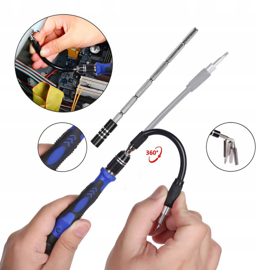 - Elastyczna nasadka przedłużająca na śrubokręt: Ułatwia dostęp do trudno dostępnych miejsc.