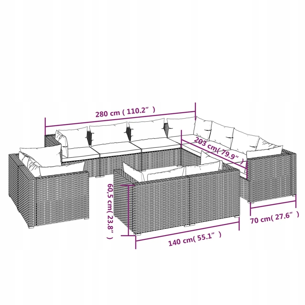 Modny, 11-częściowy, polirattanowy zestaw wypoczynkowy do ogrodu będzie znakomitym dodatkiem do Twojej przestrzeni na świeżym powietrzu. Wprowadza odrobinę nowoczesnej elegancji na Twój taras, balkon lub do ogrodu za sprawą subtelnego i stylowego wzornictwa.