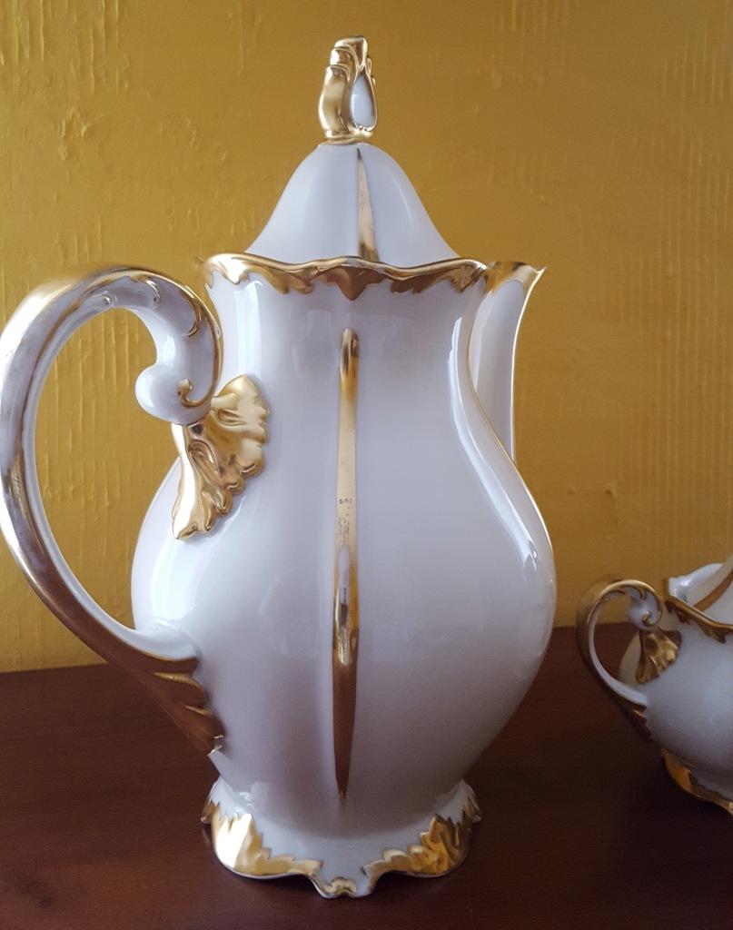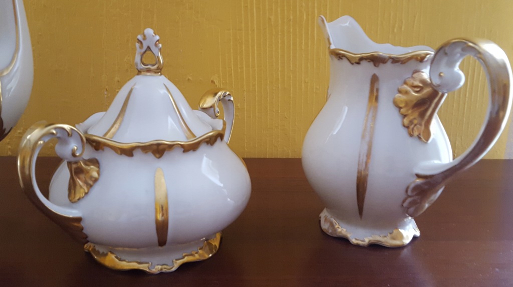 Niewielkie przetarcia złoceń wynikające z użytkowania.Wysokość całkowita dzbanka 29 cm,mlecznika-15 cm,cukierniczki-14 cm.