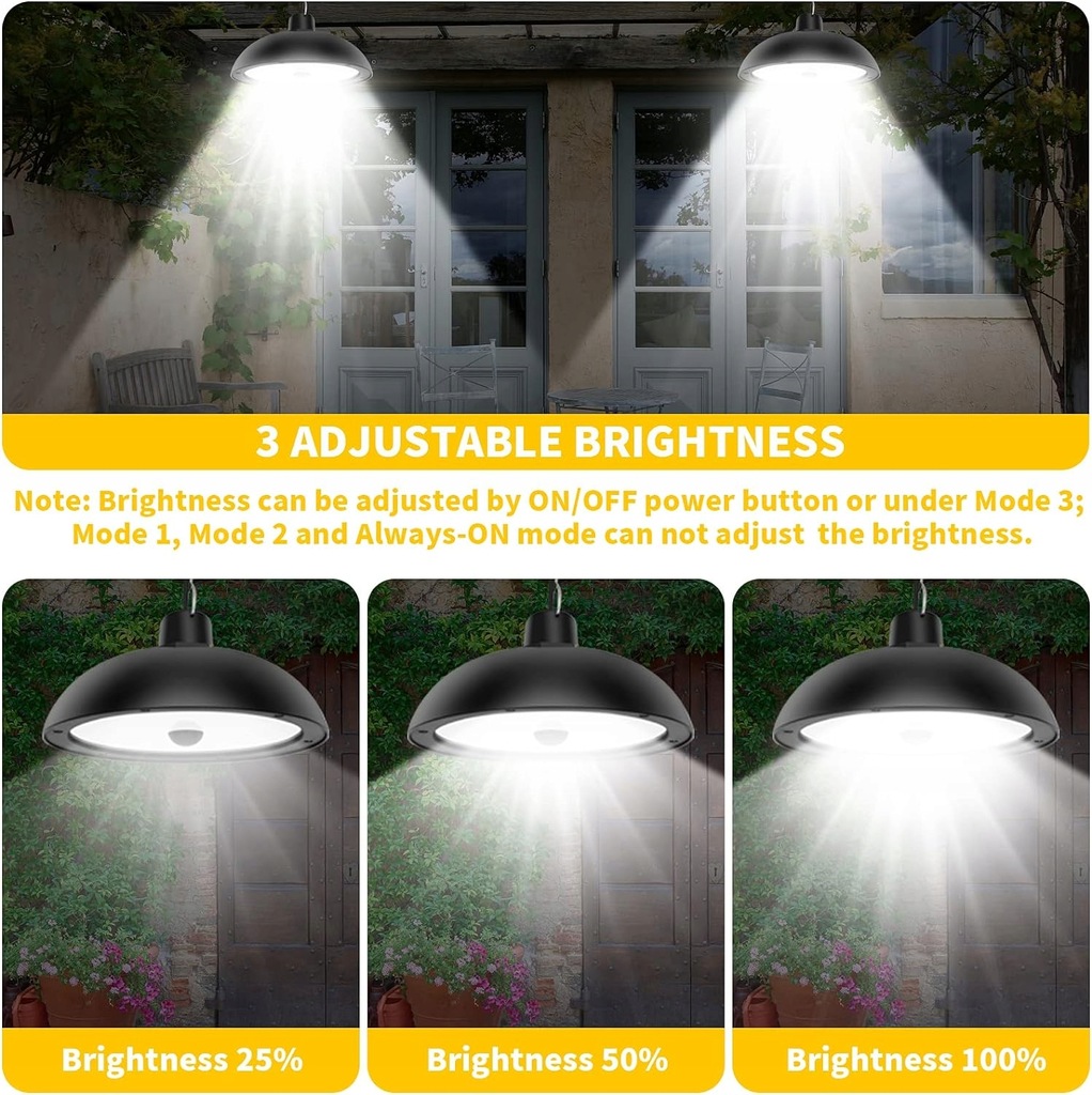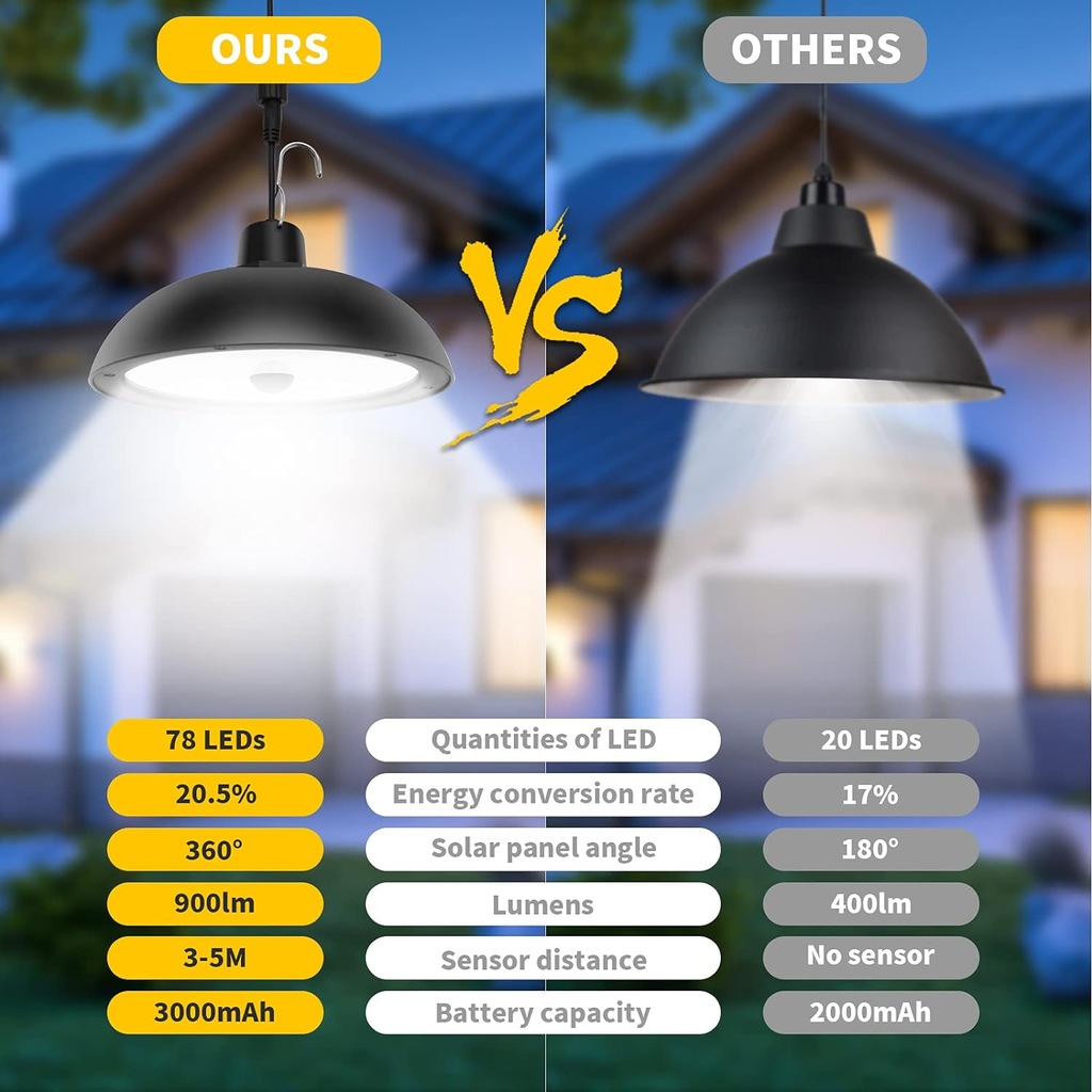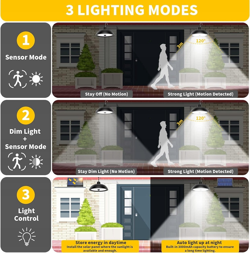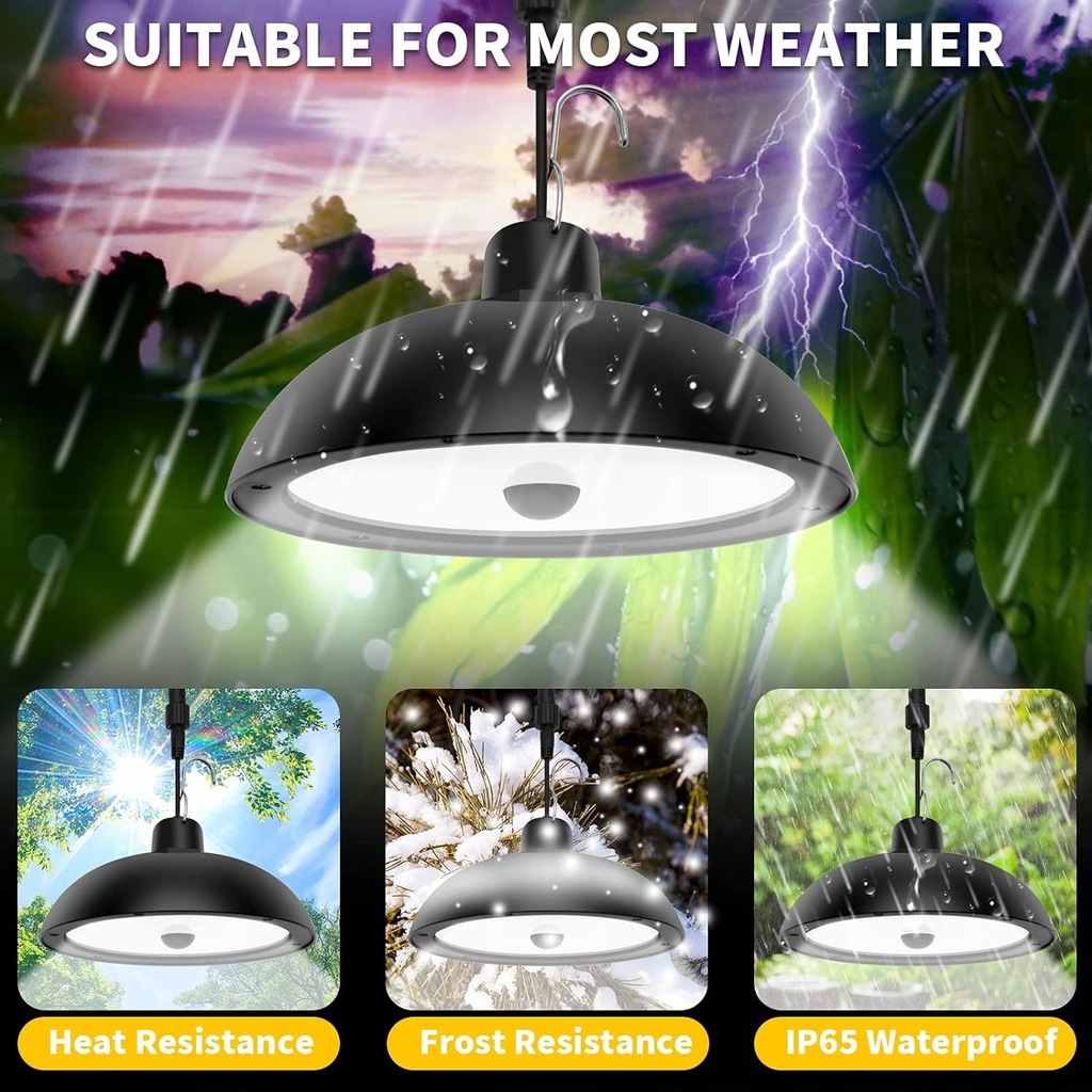 Zastosowanie wewnątrz i na zewnątrz: możliwość elastycznego montażu. W przeciwieństwie do zwykłych lamp solarnych, których można używać wyłącznie na zewnątrz. Dodano tryb ALWAYS ON — znacznie lepszy od innych słonecznych lamp wiszących, które można włączyć tylko w nocy. Dodany tryb wykrywania: włącza się, gdy ludzie przychodzą i wyłącza się, gdy ludzie wychodzą, dzięki czemu nocne czynności są wygodniejsze i oszczędzają energię.