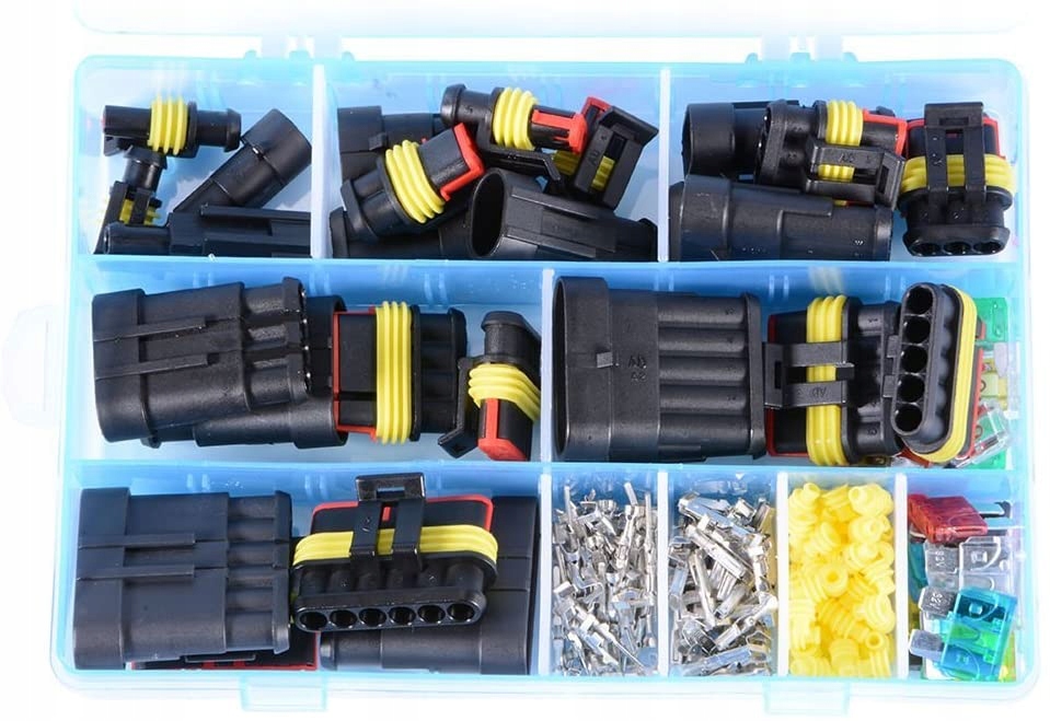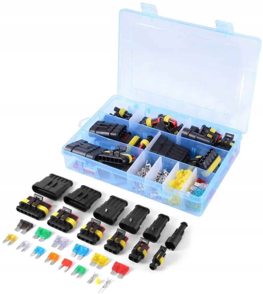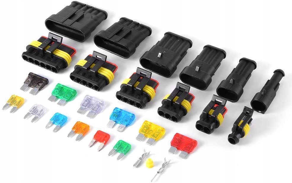 - 1-pinowe, 2-pinowe, 3-pinowe, 4-pinowe, 5-pinowe i 6-pinowe wodoodporne zestawy złączy przewodów elektrycznych z bezpiecznikami standardowymi i mini.