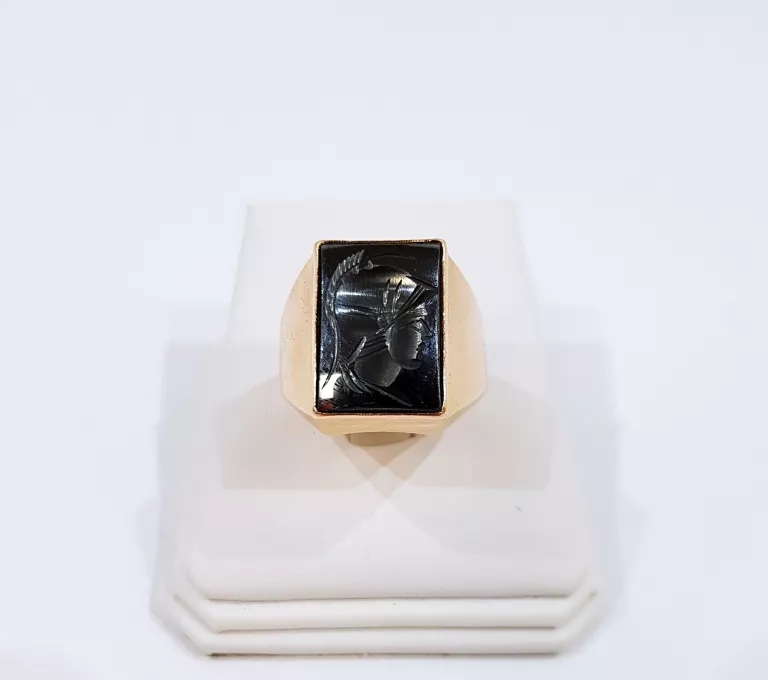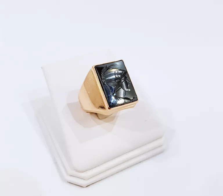 sygnet wykonany ze złota próby 585, z wygrawerowaną głową rzymskiego legionisty w hematycie.