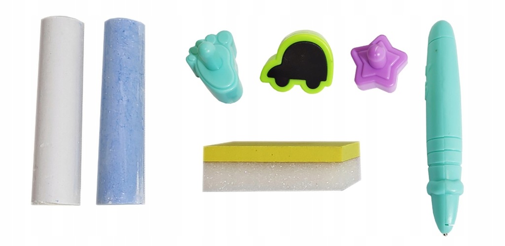 Wraz z tablicą (znikopisem) są 3 magnetyczne stempelki w kształcie stopy, gwiazdy i samochodu oraz rysik.