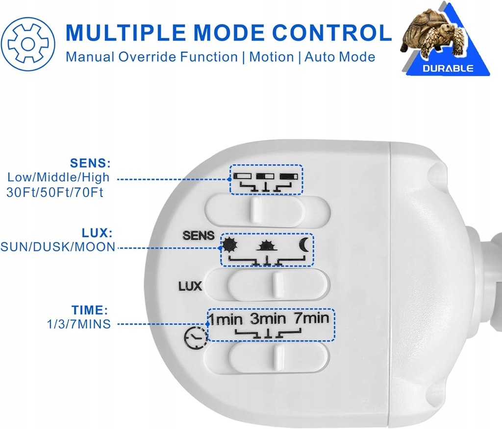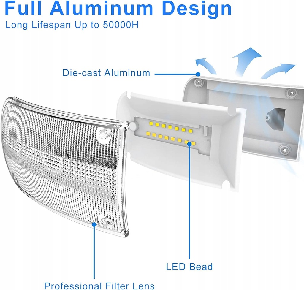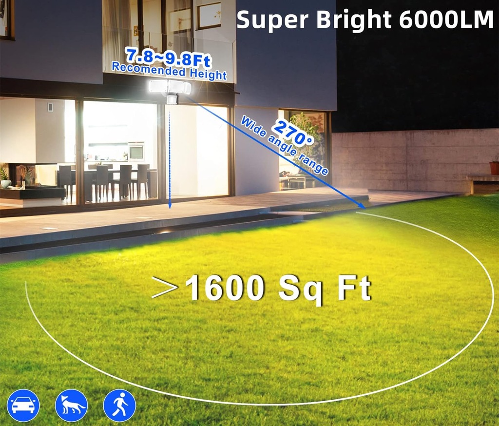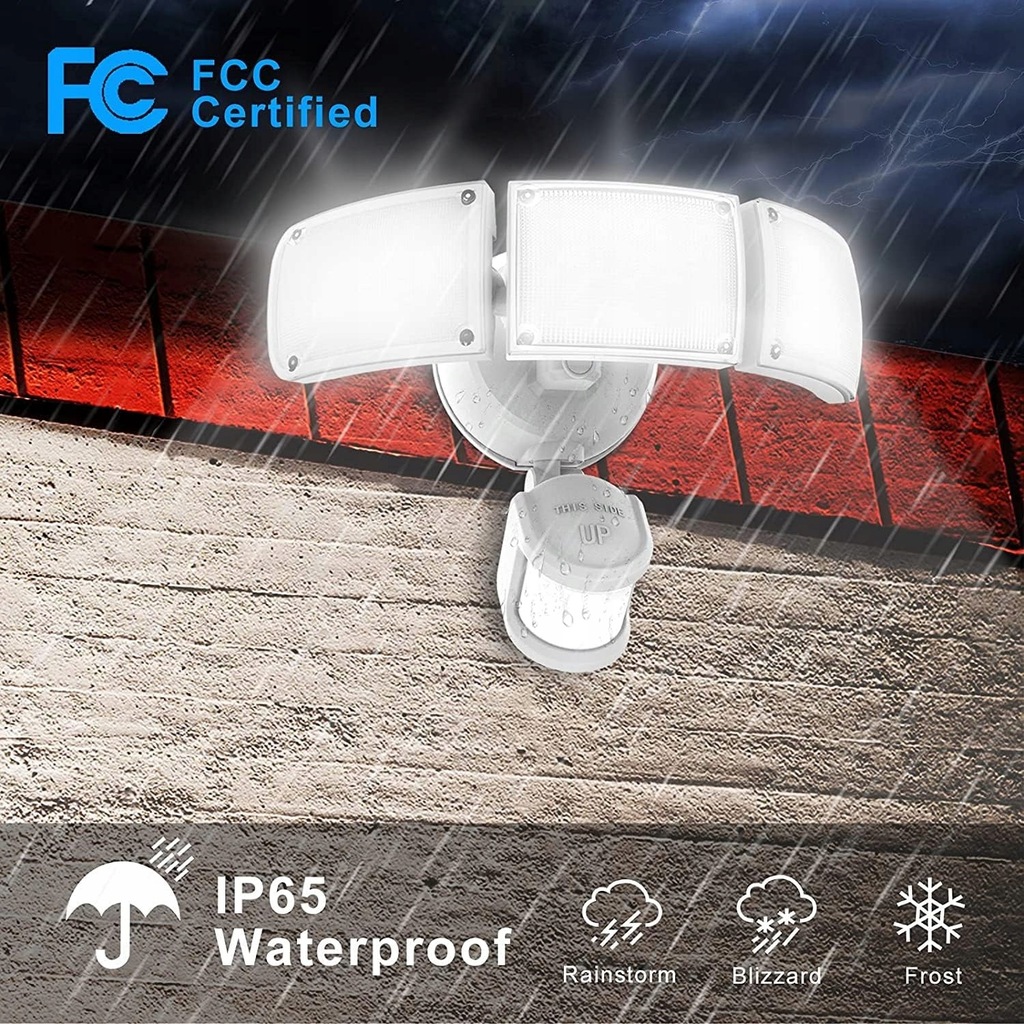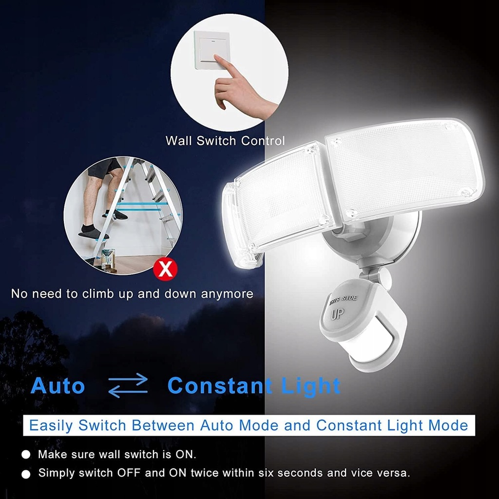 nan Produkty ZOFO, wykonane z drogich i niezawodnych materiałów, są prawie nie do uszkodzenia nawet po 10 latach zawieszenia na zewnątrz, co zmniejsza koszty dodatkowych napraw. Jeśli masz jakiekolwiek problemy z naszymi produktami, nie wahaj się z nami , a my zapewnimy najbardziej profesjonalną i entuzjastyczną obsługę. Zakres dostawy: 1 x obudowa oświetleniowa, 2 x plastikowa wtyczka ścienna, 1 x dekoracyjna osłona, 1 x płyta montażowa, 2 x śruba mocująca, 4 x kolumna podnosząca, 1 x podręcznik użytkownika (może nie być dostępny w języku polskim). Ustawienie LUX - to ustawienie jest używane do sterowania oświetleniem otoczenia, dzięki czemu światło bezpieczeństwa włącza się po wykryciu ruchu. 1. Przesuń przełącznik "Lux" w pozycję "SUN". Światło włącza się w świetle dziennym, o zachodzie słońca lub w ciemności. 2. Przesuń przełącznik "Lux" w pozycji "DUSK", światło włącza się o zachodzie słońca lub w ciemności. 3. Przesuń przełącznik "Lux" w pozycję "MOON", światło włącza się w ciemności. Niebieski wskaźnik LED - przyjazna dla użytkownika niebieska lampka kontrolna. Dzięki temu zawsze wiesz, czy czujnik PIR działa prawidłowo. Niebieska dioda LED miga, aby wskazać, że czujnik PIR działa prawidłowo. Wodoszczelność IP65 i wysoka jakość - wodoszczelność IP65, ulepszone uszczelnienie jest odporne na wszelkiego rodzaju złe warunki atmosferyczne, takie jak ulewny deszcz, szarobrąz, śnieg i grad, bez obaw o to, że woda wniknie lub pęknie. Lampę można bez problemu używać na zewnątrz przez dłuższy czas. Również trwałe lakierowanie fortepianowe nie jest porównywalne z żadnym innym produktem na rynku. Dzięki żywotności do 100 000 godzin jest bezpieczniejszy w użyciu. Regulowany kierunek światła i czas świecenia - w porównaniu do tradycyjnych reflektorów z jednym głowicą, reflektory ZOFOO mają więcej głowic, większy wybór kątów oświetlenia, więcej regulowanych kątów i prosty, innowacyjny wygląd. Kąt świecenia wynosi około 270°. Lampa ma 3 głowice, które można indywidualnie obracać we wszystkich kierunkach i przechylać. Można je skierować w wybranym kierunku i w ten sposób oświetlić większą powierzchnię. Czas świecenia można ustawić (1 min/3 min/7 min). Jeśli chcesz, aby światło świeciło w sposób ciągły, bez sterowania czujnikiem, można to osiągnąć za pomocą łatwej obsługi. Z czujnikiem ruchu i regulowanym zakresem wykrywania - wysoka autonomia. Reflektor jest wyposażony w zaawansowany japoński czujnik ruchu PIR o maksymalnym kącie wykrywania ruchu 240° i maksymalnej odległości wykrywania ruchu 22 m. Za pomocą czujnika ruchu można również ograniczyć zanieczyszczenie światła. Jest to również bezpieczeństwa, ponieważ nagłe zapalenie się światła, gdy ktoś się zbliża, odstrasza niechcianych gości, co również zmniejsza ryzyko upadku i włamania. Intensywność obszaru wykrywania można ustawić na trzech poziomach (30ft/50ft/70ft). Łatwy montaż i wiele możliwości użytkowania - ten reflektor charakteryzuje się najwygodniejszą metodą instalacji. Lampa bezpieczeństwa jest zasilana prądem zmiennym i jest wykonana w 4 prostych krokach: 1. Zamontuj płytę montażową. 2. Okablowanie lampy. 3. Montaż lampy. 4. Uszczelnienie wokół lampy. Ty lub elektryk powinien postępować zgodnie z instrukcjami w podręczniku. Są one często używane do oświetlenia ścian zewnętrznych, tarasów, dróg lub innych obszarów zewnętrznych, takich jak podjazdy, garaże, ogrody, schody, dziedzińca itd. Reflektor można bez problemu zainstalować w rogu, na ścianie lub pod dachem. Wysoka jasność i oszczędność energii i 5000 K - ulepszona lampa bezpieczeństwa do użytku na zewnątrz wykorzystuje niemieckie ultrajasne diody LED jako źródło światła i oświetla obszar ponad 1600 metrów kwadratowych. Wytwarza wyjątkową jasność 6000 lm/5000 K (białe światło dzienne), co odpowiada około 60 x 10 W żarówkom halogenowym 55 x 10 W i może pomóc zaoszczędzić ponad 90% energii elektrycznej. Reflektor LED posiada certyfikat FCC, co jest bardziej rygorystyczne niż certyfikat ETL, a dzięki miękkiemu, nieoślepiającemu światłu można go bez problemu używać.