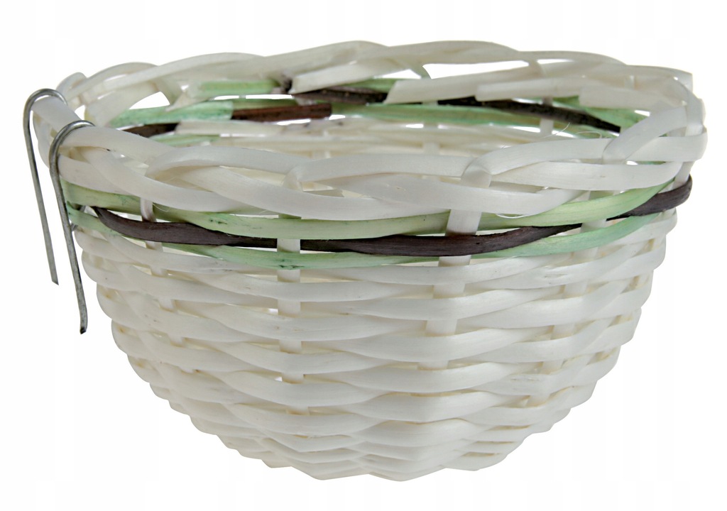 Łatwy montaż dzięki dwóm haczykom umożliwia stabilne przymocowanie gniazda do brzegu klatki , zapobiegając jego przesuwaniu się. Jasna wiklina ozdobiona zielonymi i brązowymi akcentami nadaje całości naturalny wygląd, harmonizując z otoczeniem.