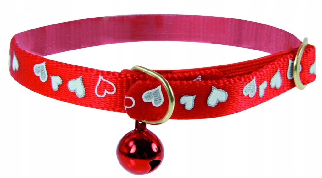Obroża dla kota wykonana z wytrzymałego nylonu z ozdobnym, odblaskowym wzorem w serca, dzięki któremu kot jest lepiej widoczny po zmroku. Wyposażona w dzwoneczek oraz gumkę, która zapobiega ewentualnemu duszeniu. Idealnie dopasowuje się do szyi kota. Obrożę bardzo łatwo wyczyścić wilgotną gąbką.